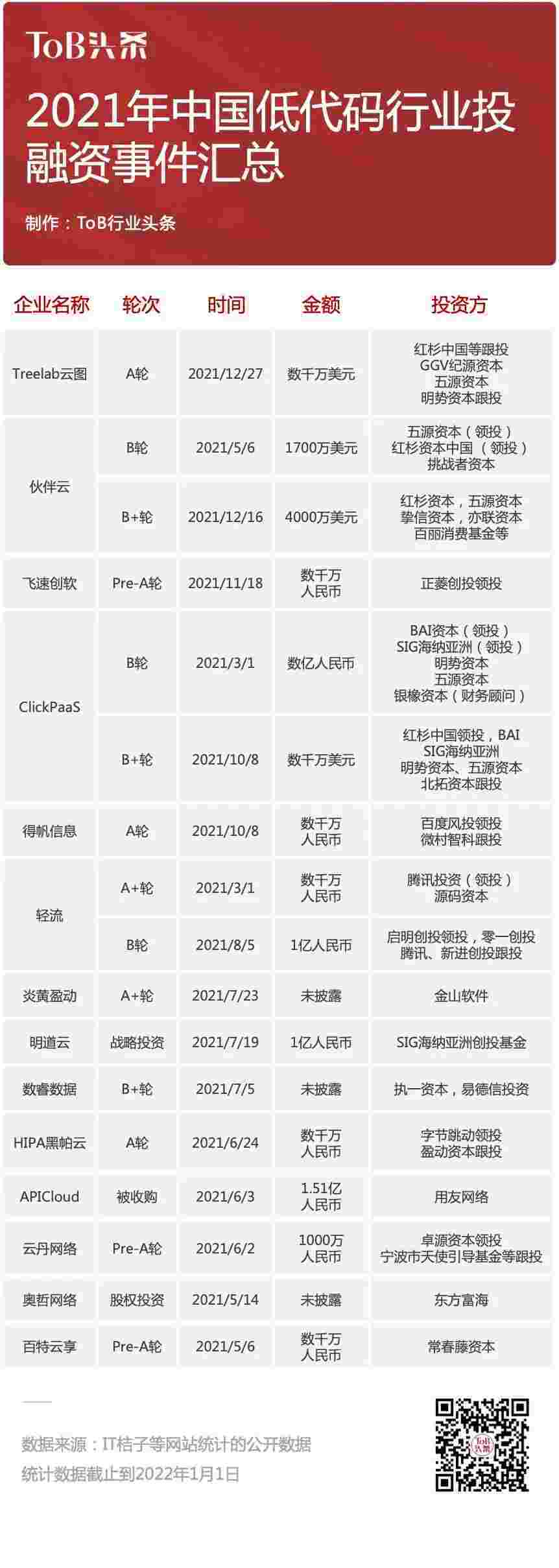 到2021年,,,无/低代码投融资规模势头更甚,,其中包括轻流两轮融资(A+轮数千万人民币,,,,B轮近亿人民币)、、、、圆梦钱包 两轮融资(B轮数亿人民币,,,,B+轮数千万美元)、、、、百特云享数千万元Pre-A轮融资......