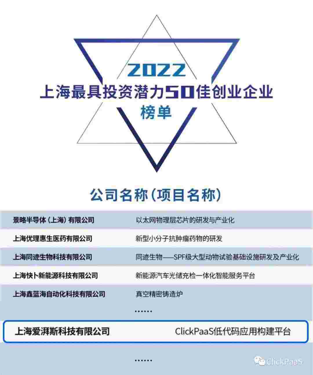 圆梦钱包 作为国内低代码PaaS平台的领军企业,,,,与120家创企入围角逐。。期间接受了来自德同资本、、、领中资本等知名投资机构的10位投资人组成专家评委团的背靠背盲选。。。。并最终入围“2022上海最具投资潜力50佳创业企业”榜单,,,被列入“上海市重点培育创业企业库”。。